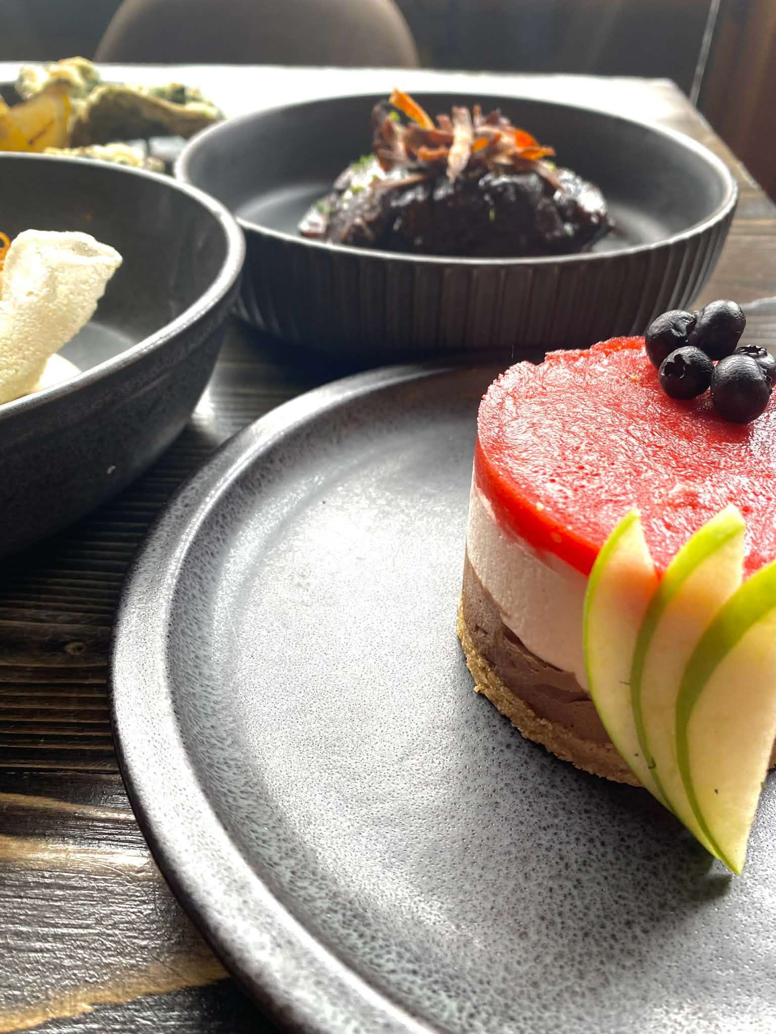 - Tartare de saumon fenouil marinée, pommes, concombres et crème fraîche carvi.