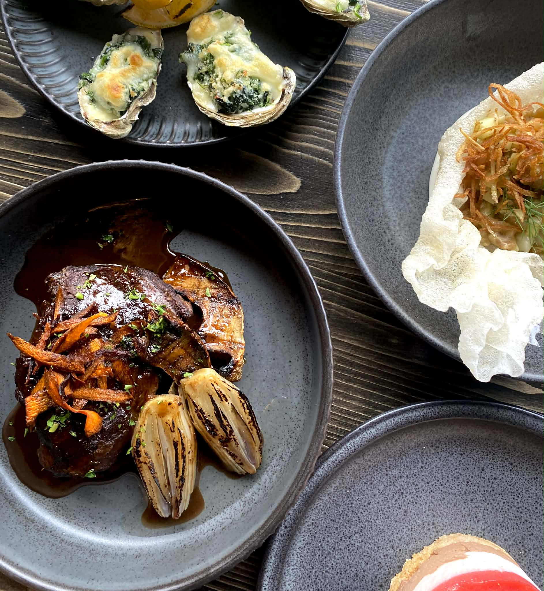- 1 Joue de bœuf braisée au vin rouge, pleurotes king et échalotes confites.